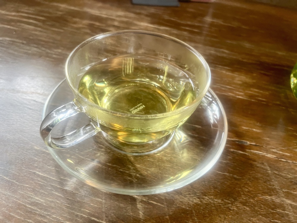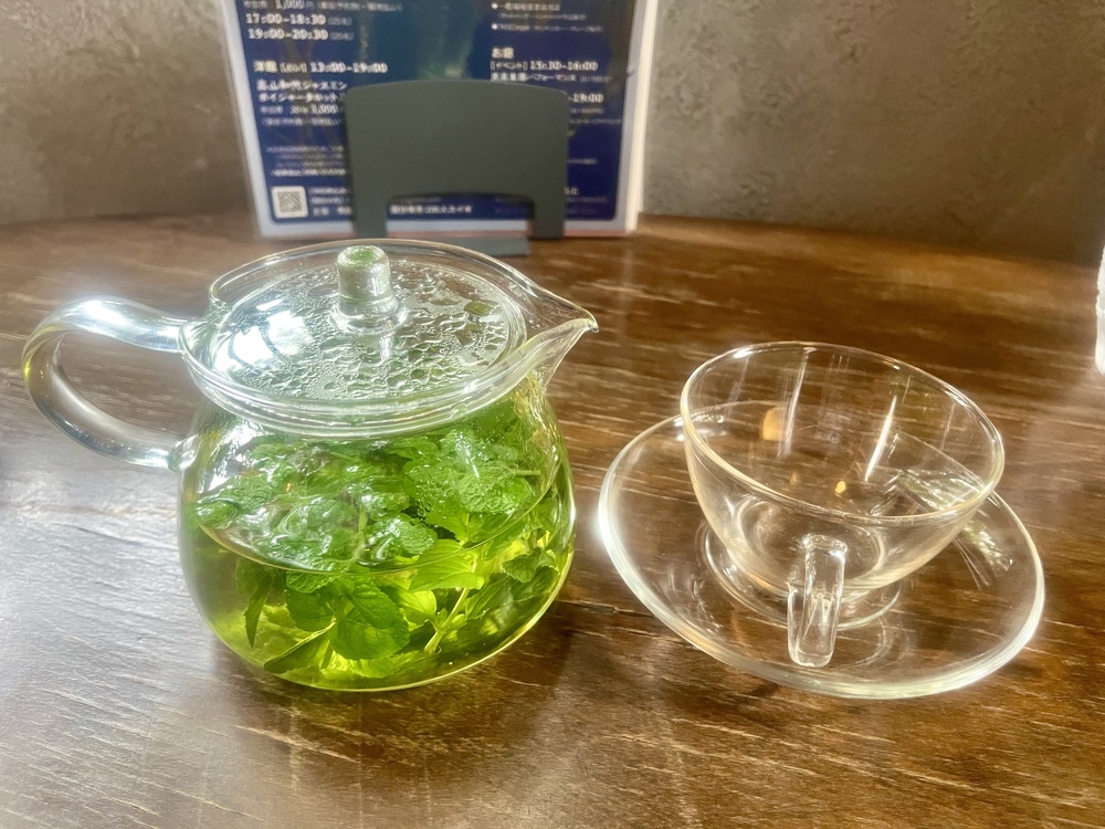 でも、カフェおきもとで栽培されたミントを使ったミントティーにも心引かれます。迷いましたが、あわせて頼むことにしました。