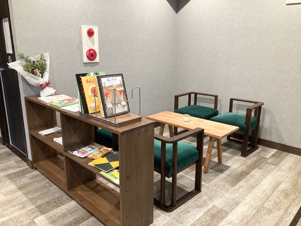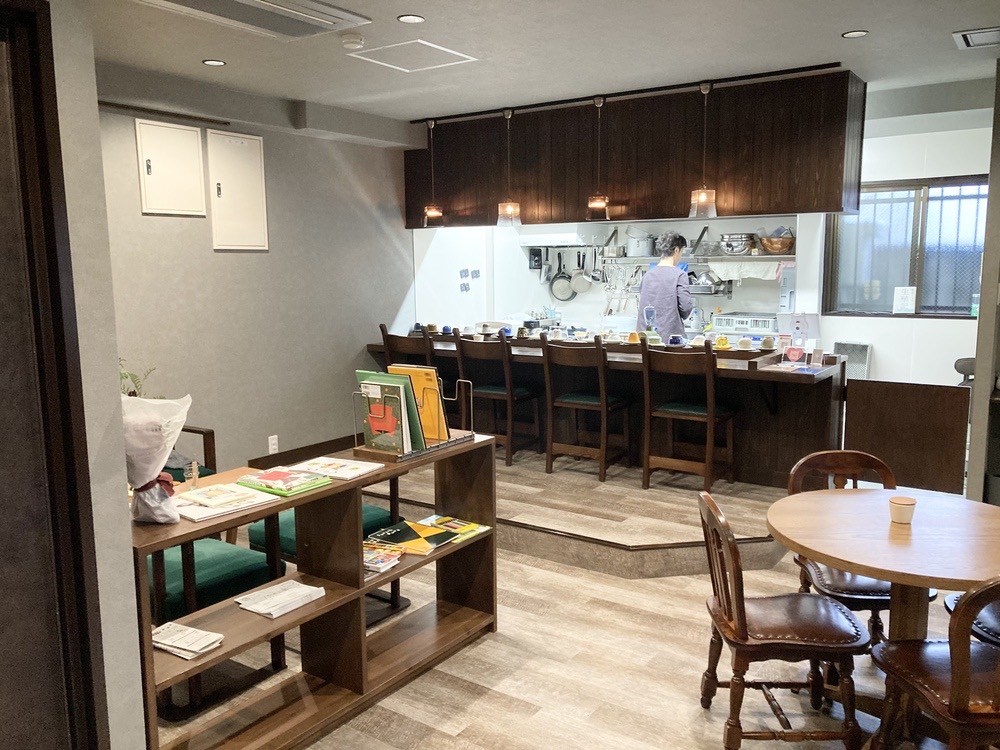店内に入ると右手の奥に厨房、その前にカウンター席、中央と奥にテーブル席があり、お子様用の絵本などが置いてある棚がその間にありました。