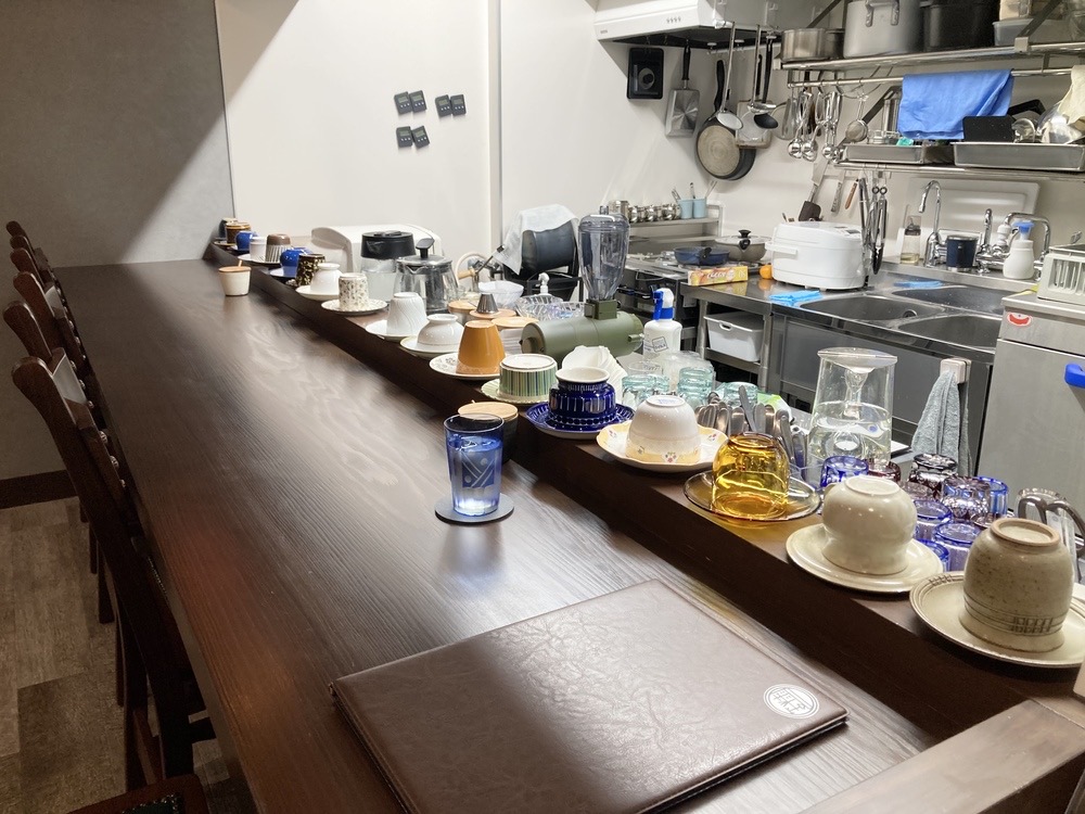 厨房前のカウンターには、さまざまな形状で色やデザインの異なるコーヒーカップが並べられていて、とても華やかです。