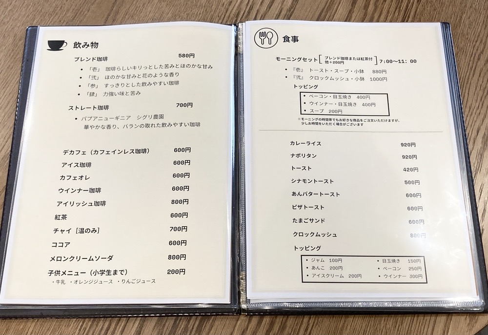 モーニングはトーストとクロックムッシュの2種類あり、ブレンドコーヒーは4種から選べます♪