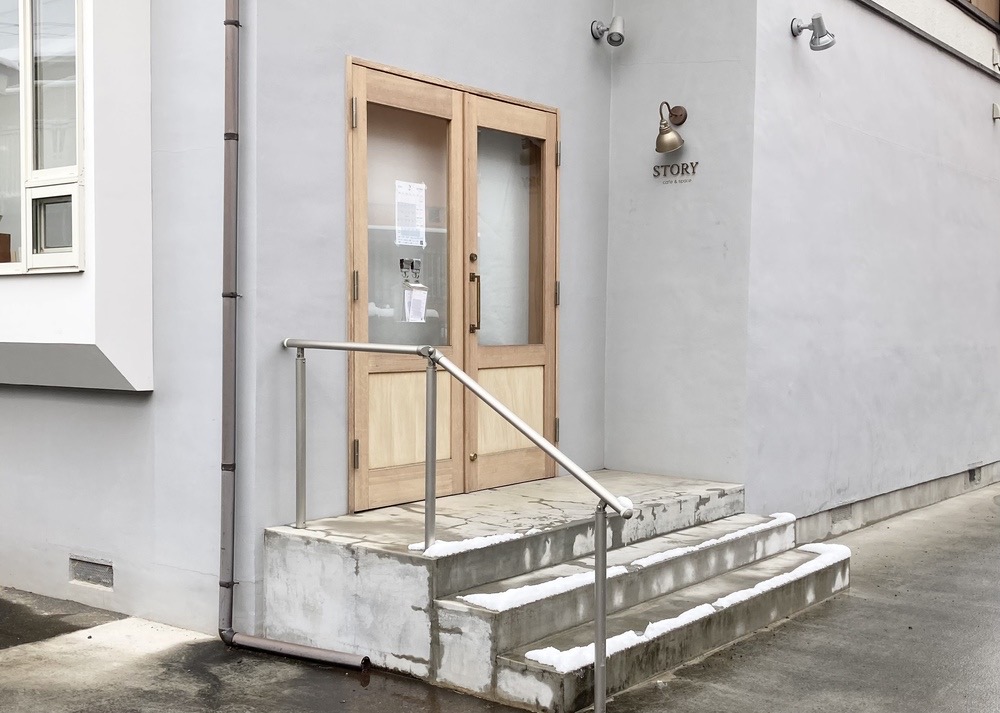無機質な印象のコンクリートの打ちっぱなしの壁と、ドアの木のぬくもり、そして照明の下の控えめなSTORYの文字のバランスがとても良くて目にとまります。