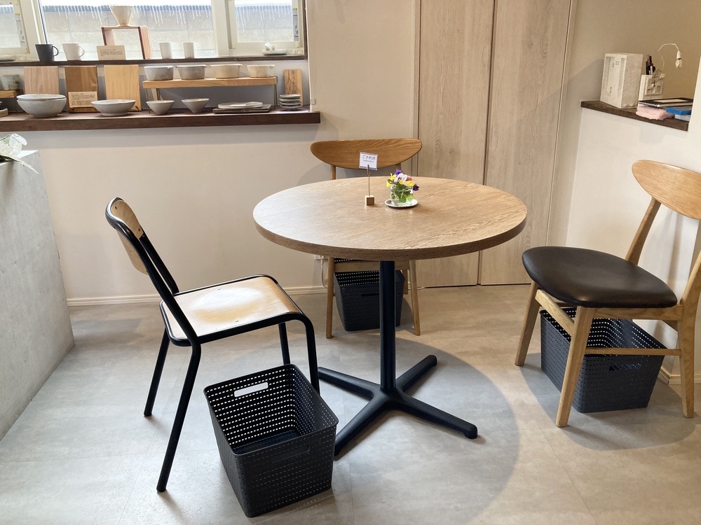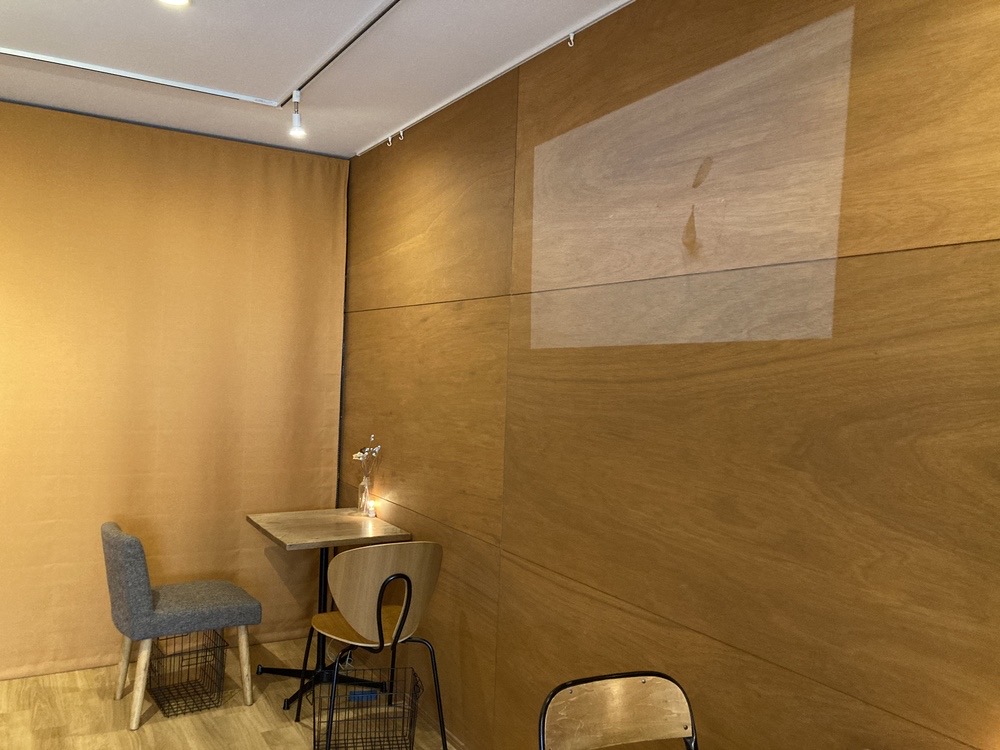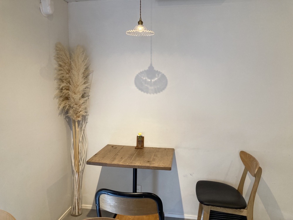 入ってすぐ右手には、奥のロールスクリーンの茶色が際立つスペースが。広く空間をとっていて、テーブル席は4つでした。