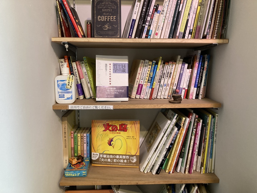 本棚の本は、コーヒーの本が多く、またお子さんも来店することもあって絵本や童画もたくさん置いてありました♪
