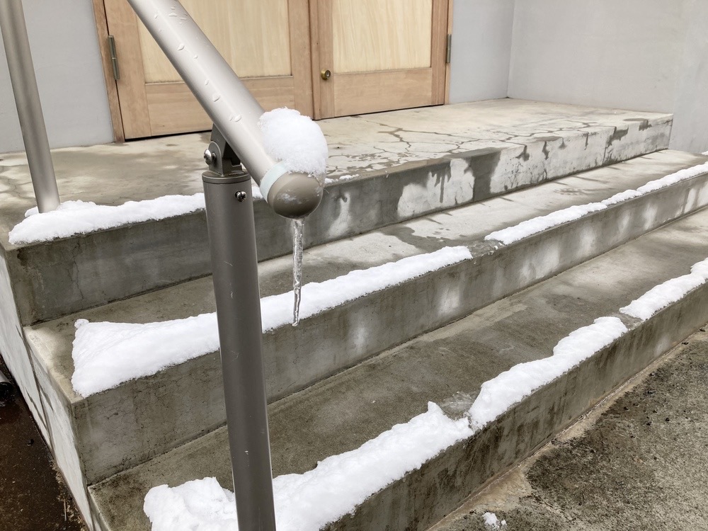 前夜の雪が少し残っていて、階段の手すりにつららができていたのがうれしくてつい写真を(笑)。