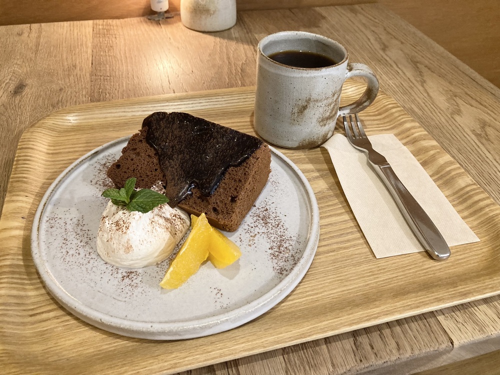 トリプルチョコの米粉のシフォンケーキは、もちもちでチョコの味がしっかりしみていて、チョコレートソースが濃厚で大満足でした!