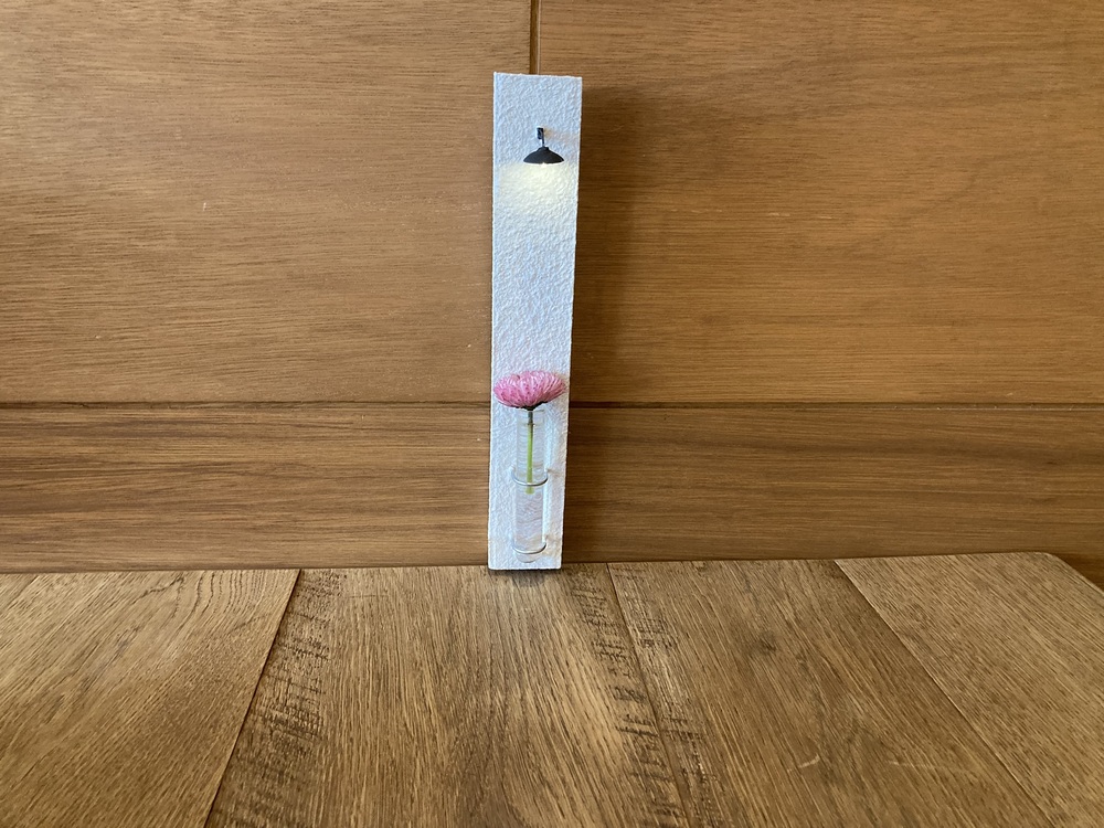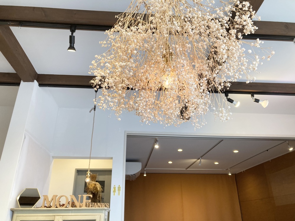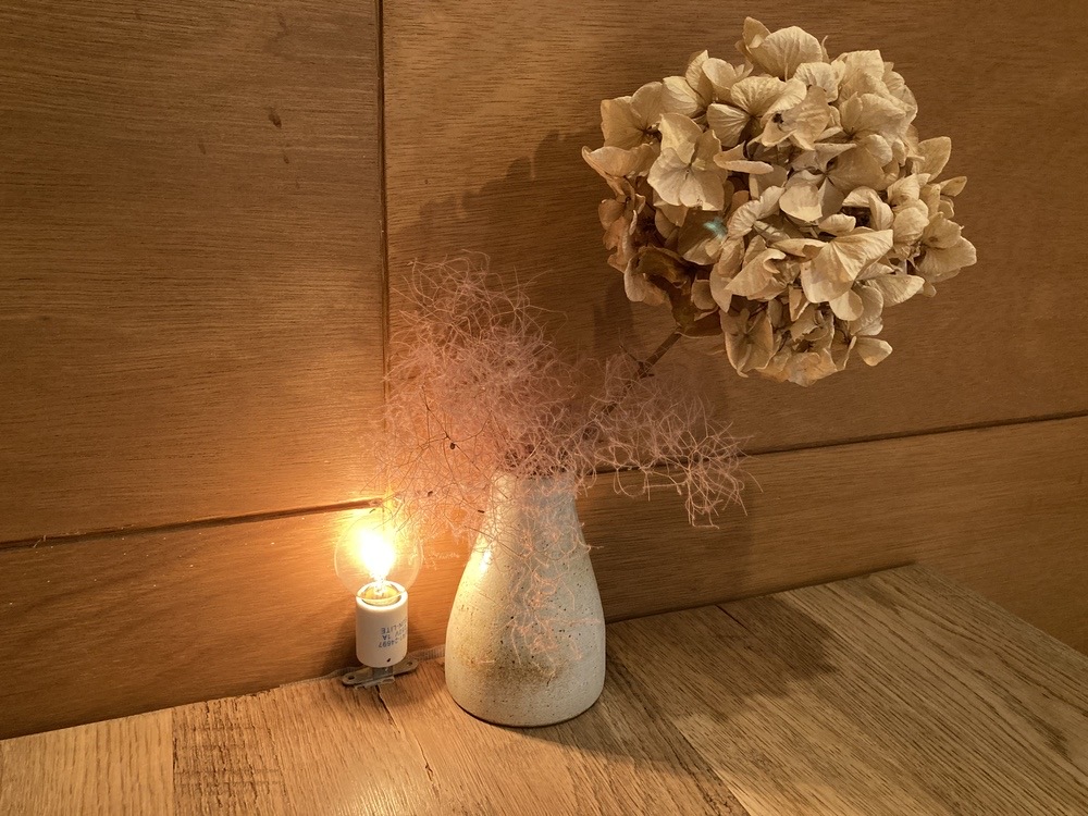まるで、壁の木の色とドライフラワー、照明も一体化しているようです。