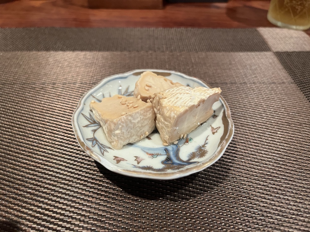 カマンベールチーズの紹興酒漬けです。チーズの濃厚な旨味に、紹興酒の香りとコクが加わって奥深い味がします。