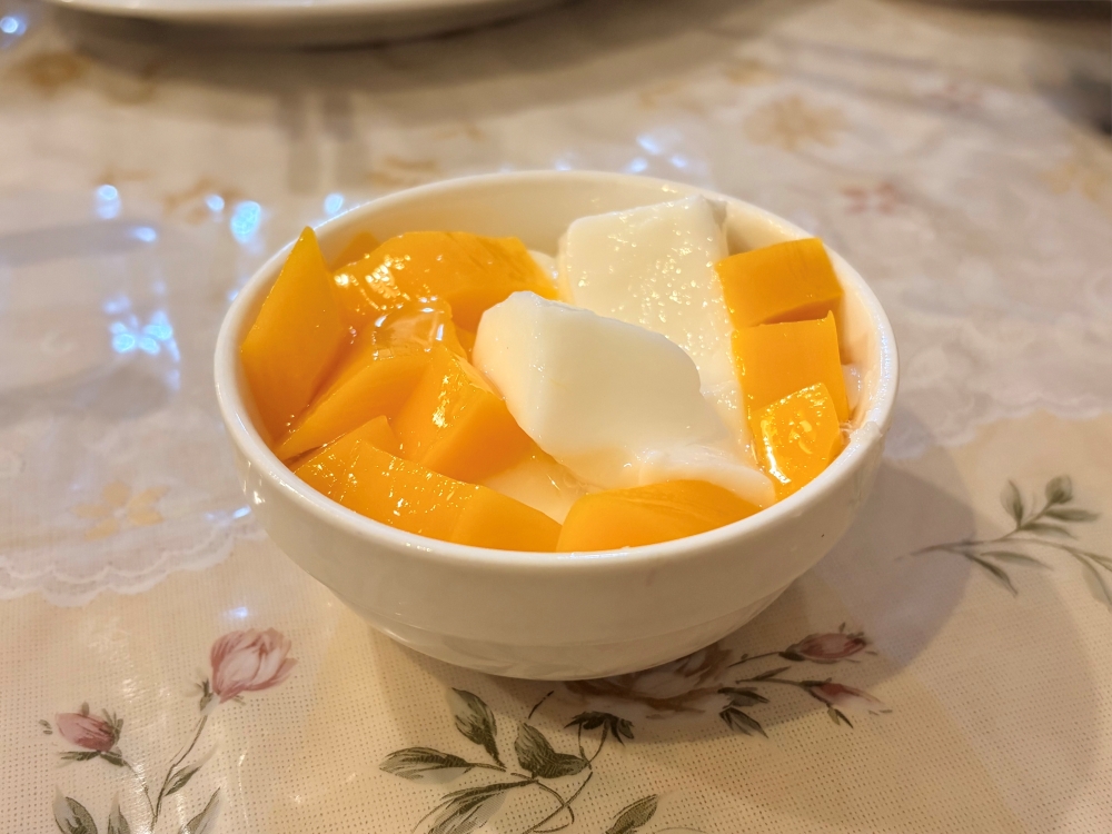 杏仁豆腐は、ぷるぷるの杏仁に、甘いマンゴー寒天が添えられた一品。