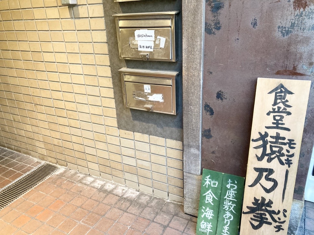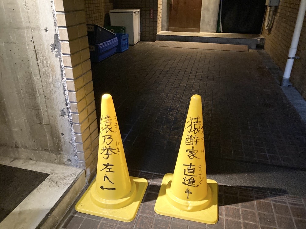 近づいてみると猿乃拳と猿酔家、それぞれの入口の案内が手書きでコーンの三角コーンの上に書いてありました。