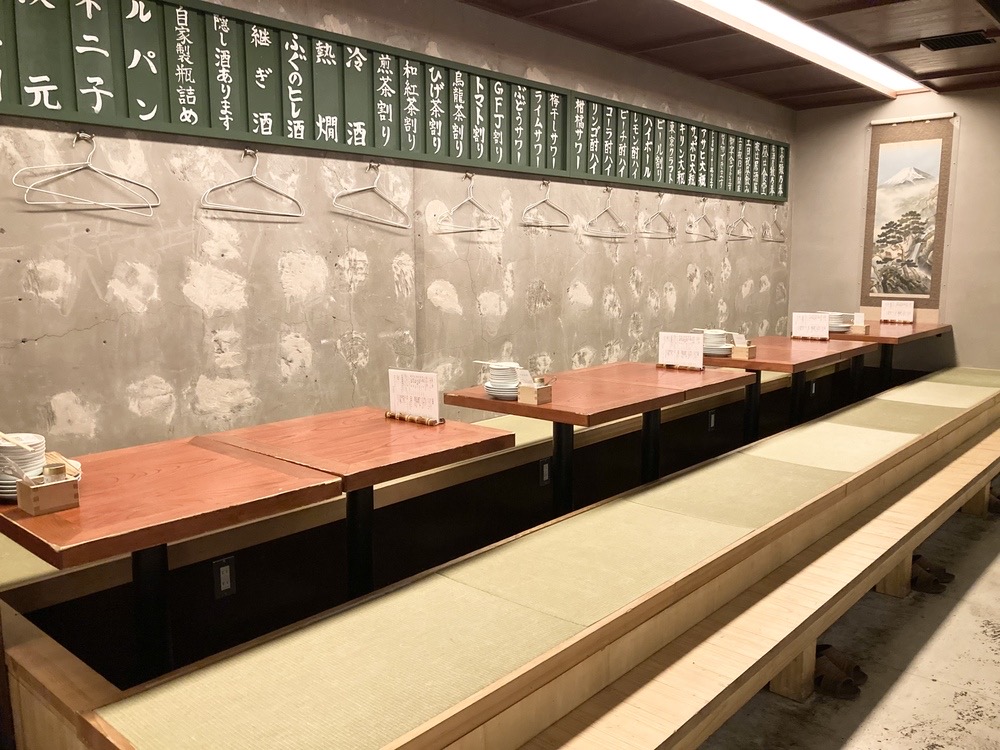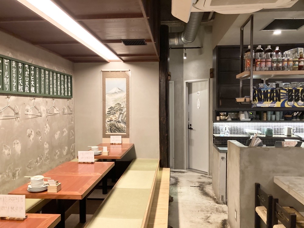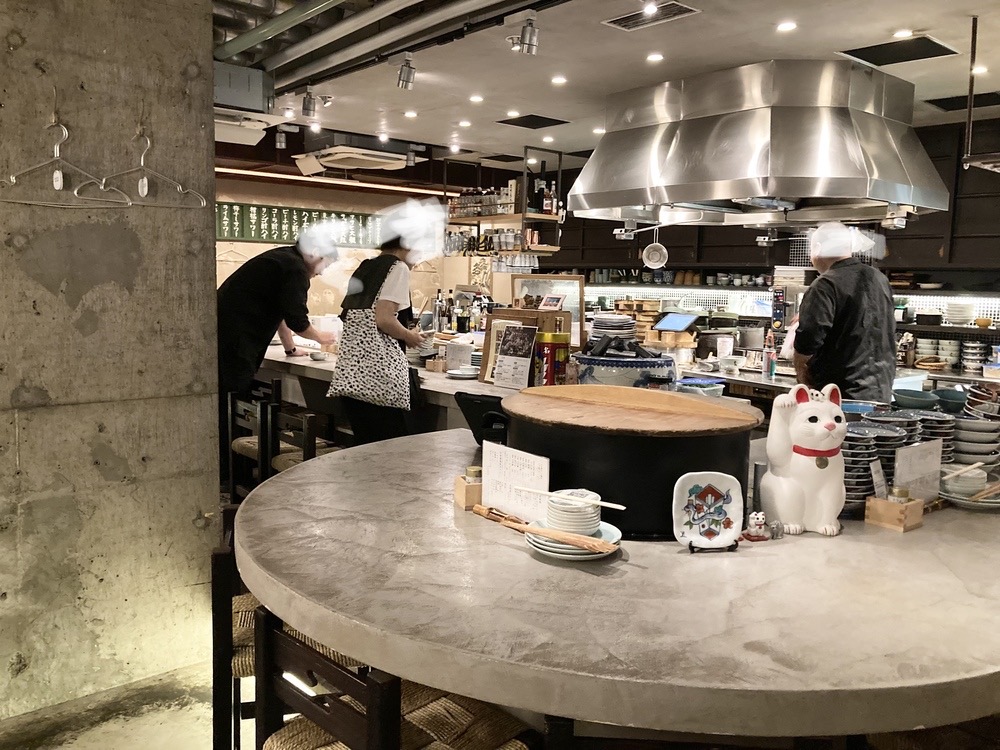キッチン、カウンターを中央にテーブル席とお座敷席が回りを囲むレイアウトになっています。