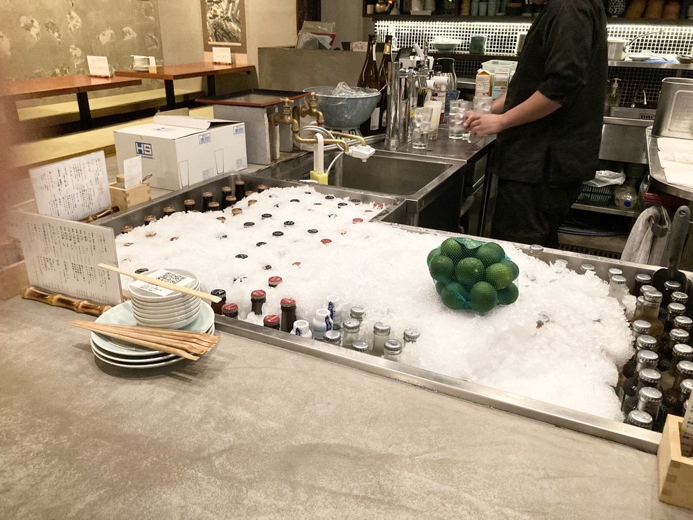 ビールはどぶ漬けとあり、カウンターの中を見ると、氷の帽子をかぶっている瓶がびっしりと並べられていました。
