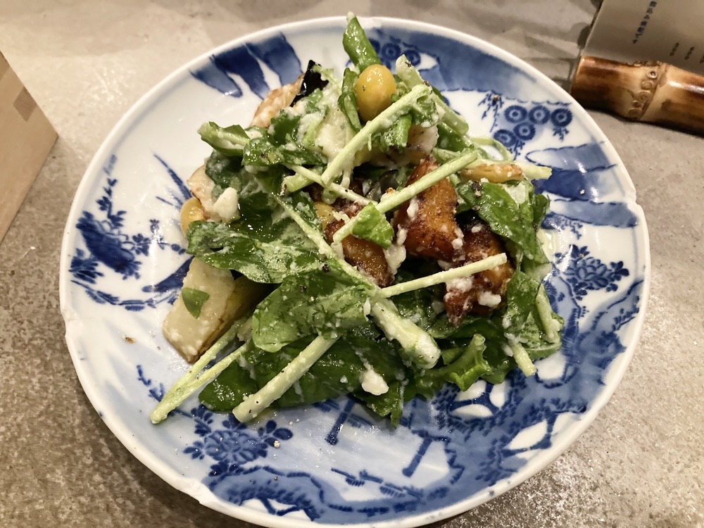 ルッコラに、ホタテ、丸茄子、南瓜とじゃがいも、素揚げした銀杏をコンソメ味のじゃがいものドレッシングで和えてあり、本当に美味しくて感動しました♪
