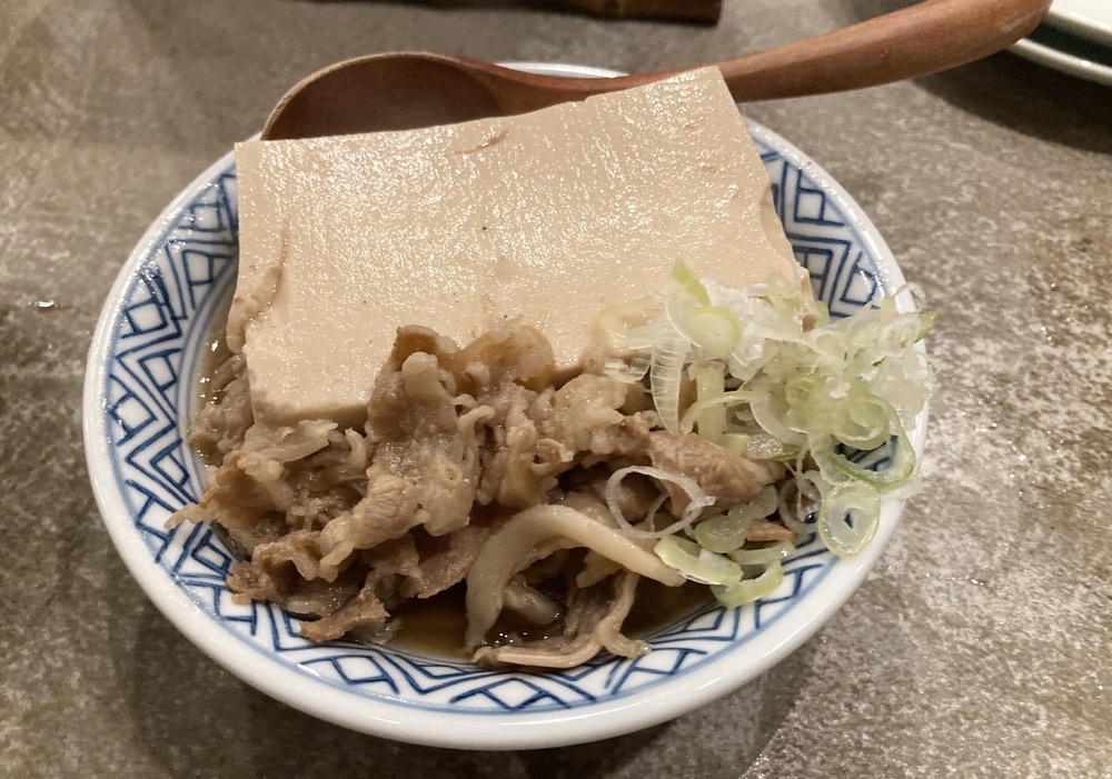 店員さんおススメの肉豆腐は、お豆腐にうま味がじっくり染みていています。