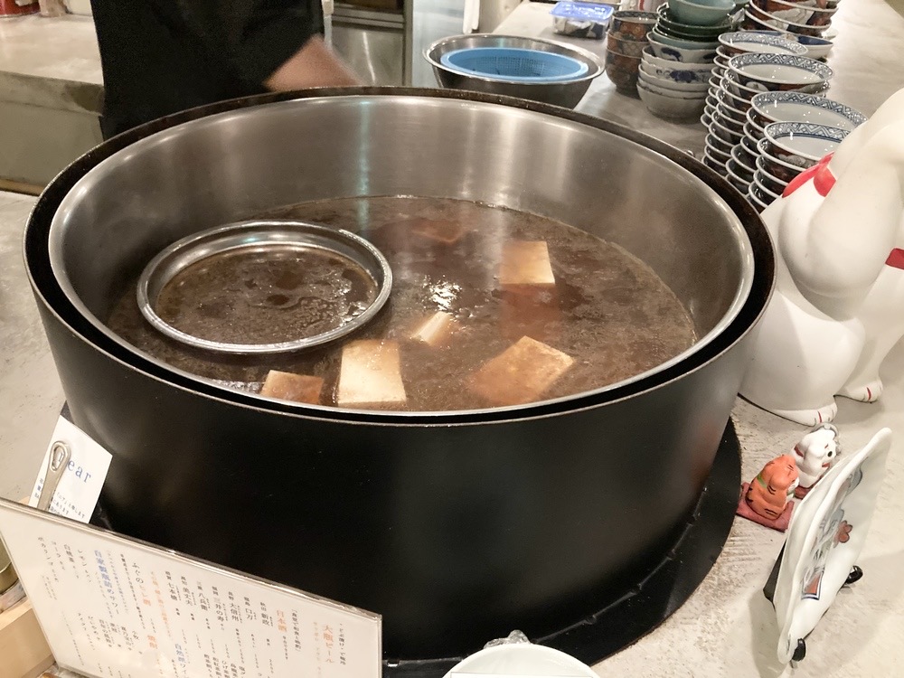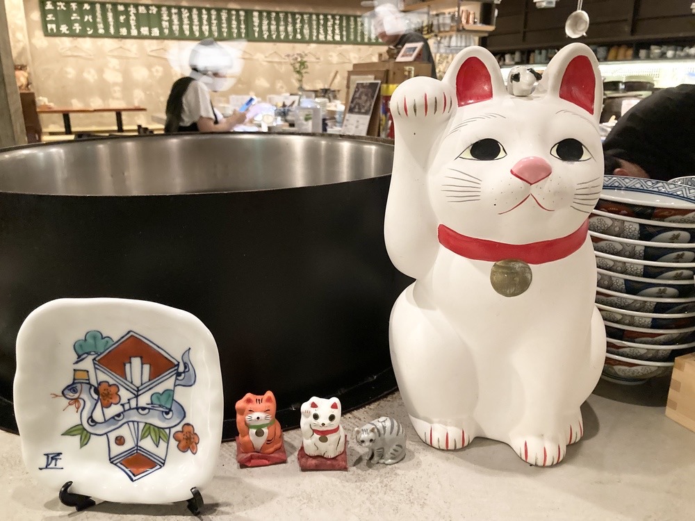 お店の看板でもある肉豆腐を煮込むための大きな鍋を背後に守りつつ、出迎えてくれる招き猫たち。