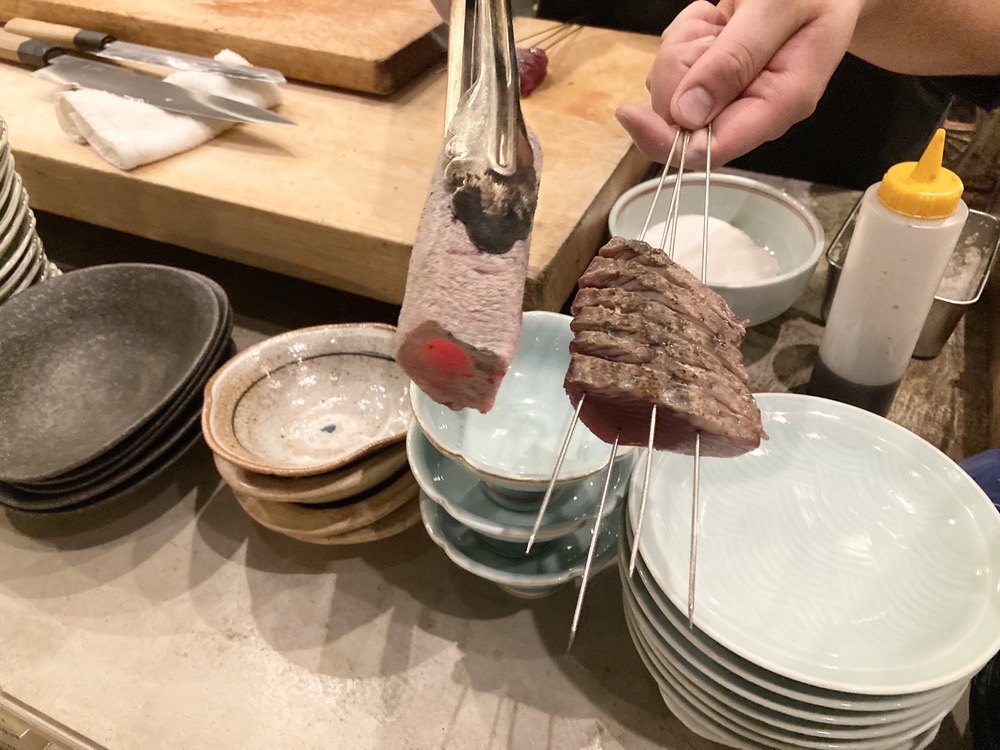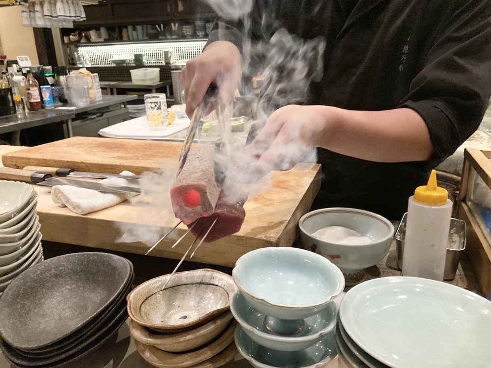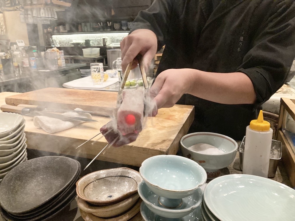 驚いたのは、目の前で熱した炭を串に刺したカツオのお刺身に当て始めたことでした。