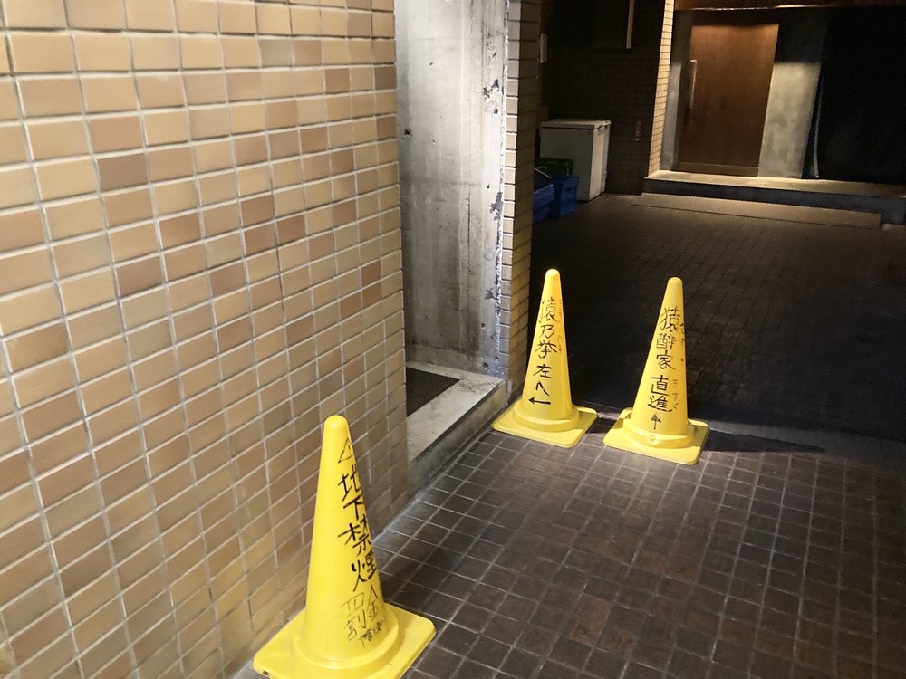 階段を降りて地下に向かうと、あれ?工事中?それとも水漏れ注意?黄色い三角コーンが見えます。