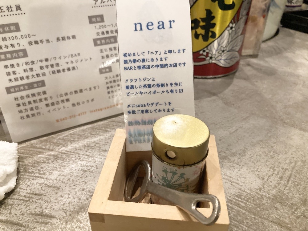 最初に座った時から気になっていた、カウンターの上に置かれた枡にnearという店名が書かれた案内文?