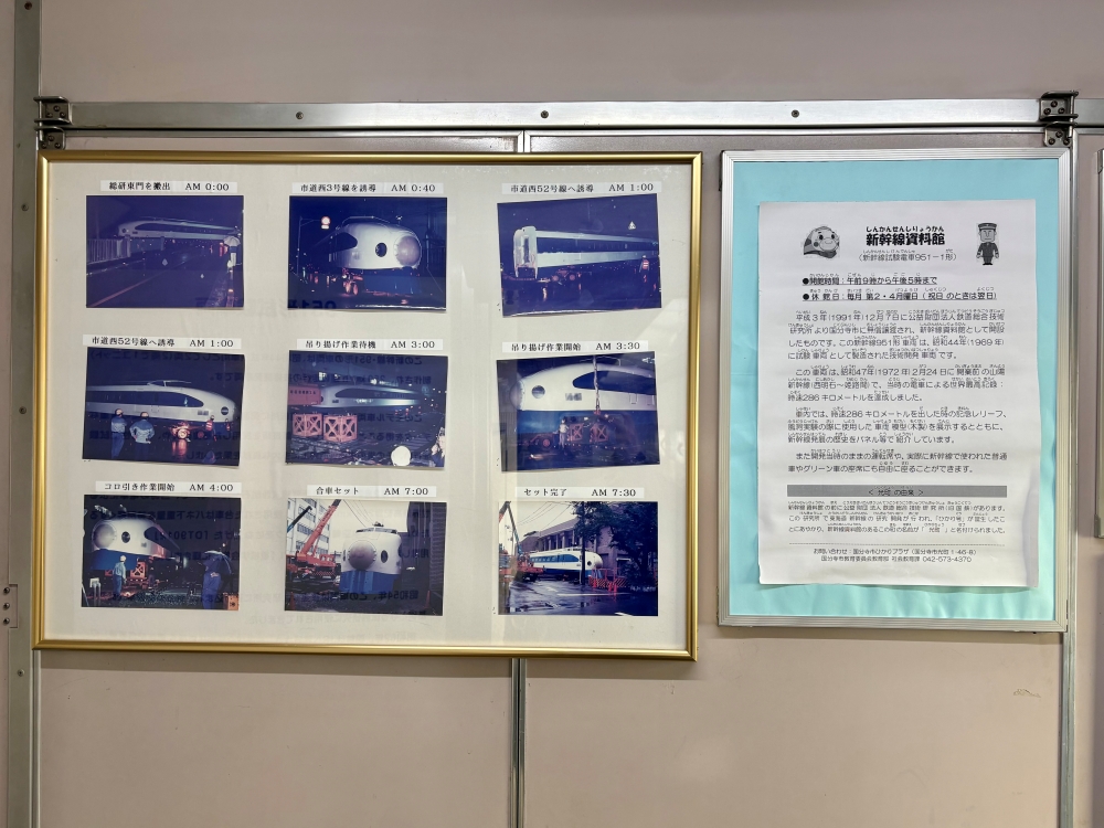この951形車両は、昭和44年に製造された技術開発用の試験車両で、 当時、電車による世界最高速度・時速286キロメートルを記録したそう。 平成3年に、公益財団法人鉄道総合技術研究所によって国分寺市に無償譲渡され、現在の新幹線資料館として公開されています。
