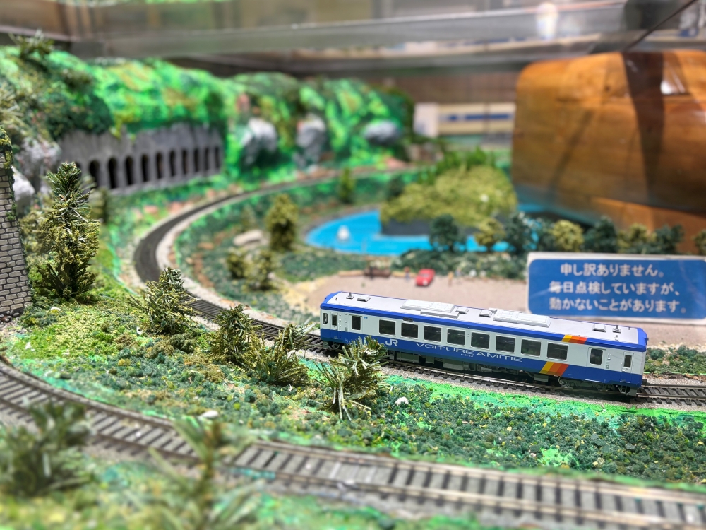 少し落ち着いたところで、ひかりプラザ内にある鉄道展示室へ移動します。 こちらは、新幹線資料館とはまた違った世界が広がっており、鉄道の過去・現在・未来の乗り物についての展示や、また別のジオラマがあります。