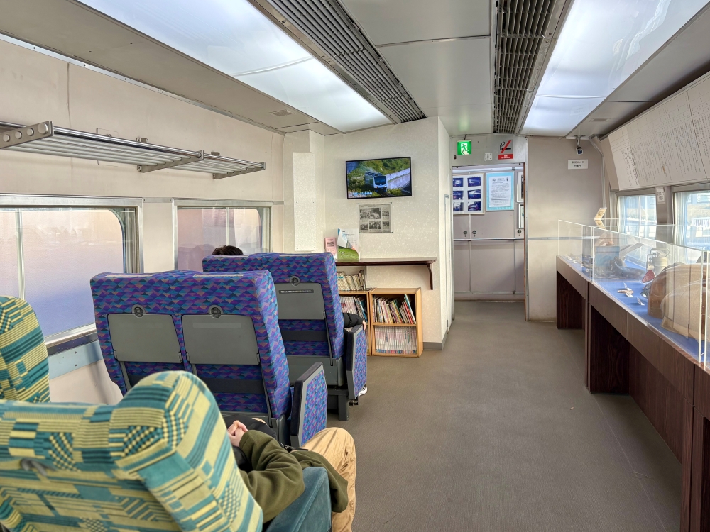 座席展示もあり、その前には、電車の映像が流れるテレビが。
