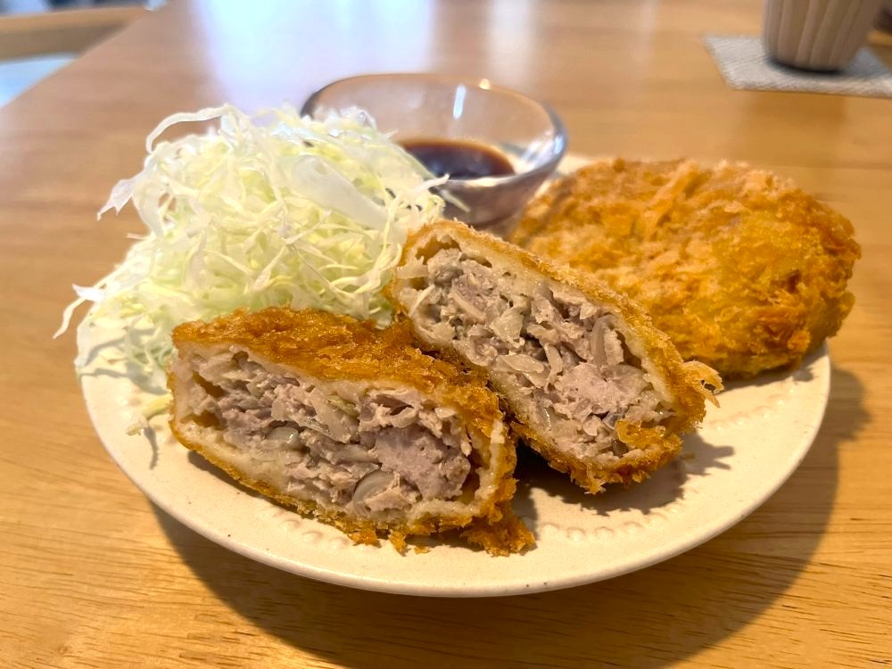 メンチカツは、ジューシーなお肉に甘くてシャキッとした玉ねぎがアクセント。