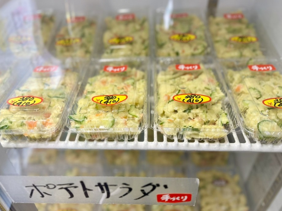 お惣菜のラインナップも豊富で、ショーケースにはマカロニサラダやポテトサラダなど、つい手を伸ばしたくなる一品がずらり。
