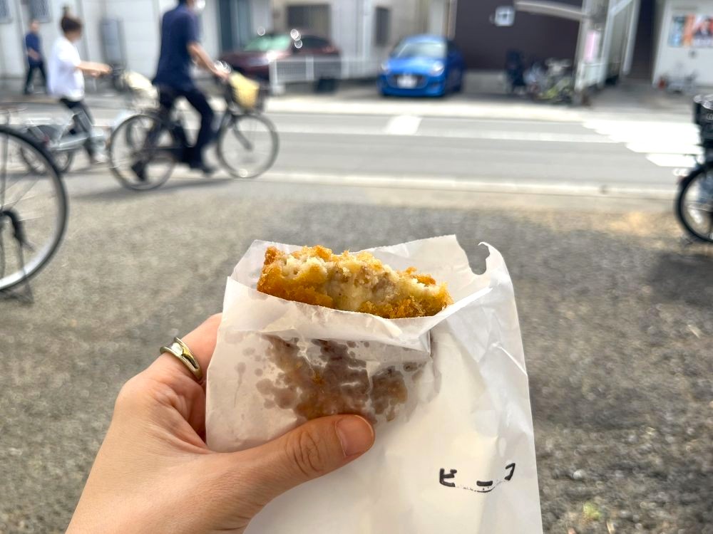お店の前のベンチで、揚げたてのビーフコロッケを頬ばっていたときのこと。