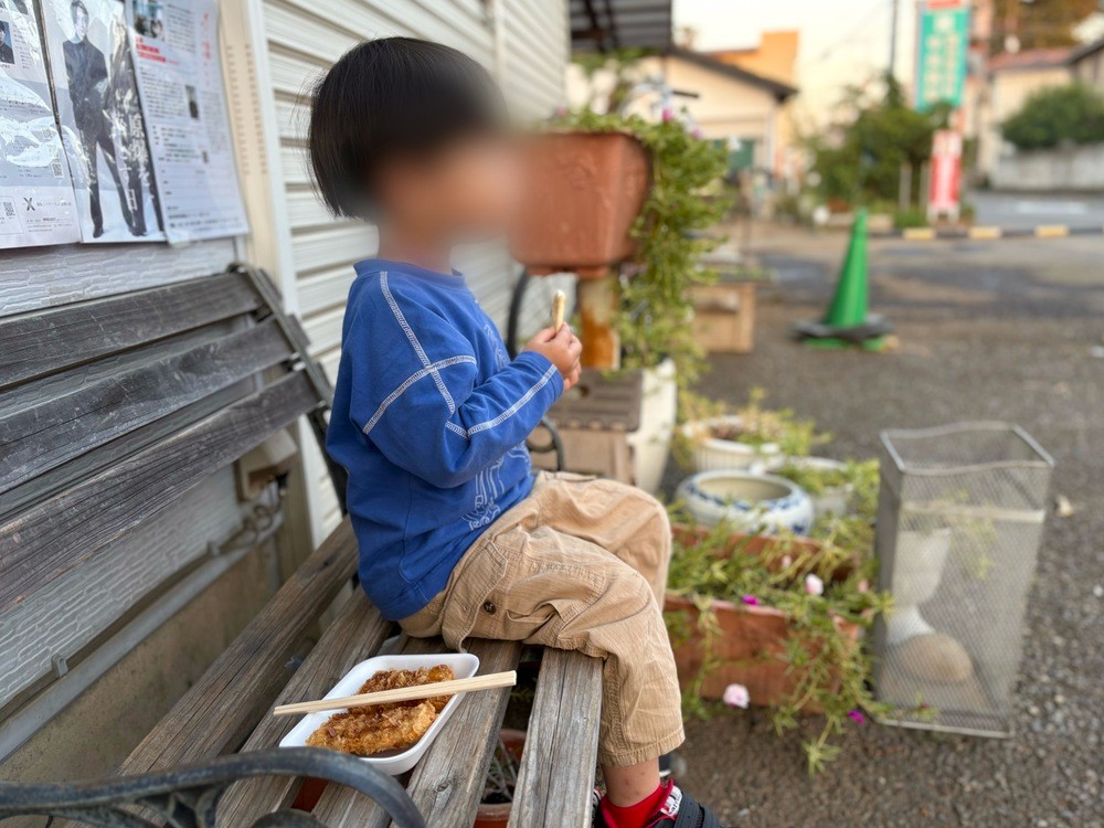 そして案の定、子どもが「食べて帰ろう♪」と言うので、お店の方に「とんかつだけベンチで食べて帰りたいのですが…」というと、「切ろうか?ソースもかける?」や「お皿にいれてあげようか。お箸もどうぞ」と、今回も変わらぬあたたかい心遣いに感激!